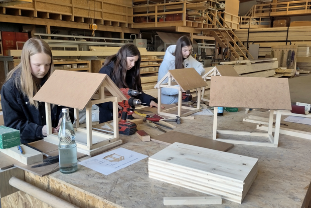 Drei Schülerinnen waren ab dem Morgen bis zum Nachmittag hier. Den größten Teil waren sie hier in der Werkstatt und am Ende des Arbeitstages circa eine Stunde auf einer Baustelle. Für die Teilnehmerinnen hatten wir extra etwas vorbereitet. Die Idee dazu hatte unsere Auszubildende Hanna. Jede Schülerin hat ein eigenes Vogelhäuschen gebaut, das sie mit nach Hause nehmen konnte. Hanna hat sich vor Ort um die circa 14- oder 15-jährigen Mädchen gekümmert. Als Frau mit Anfang 20, die sich bewusst nach einem Studium als Bauzeichnerin für den Beruf entschieden hat, war sie perfekt geeignet.