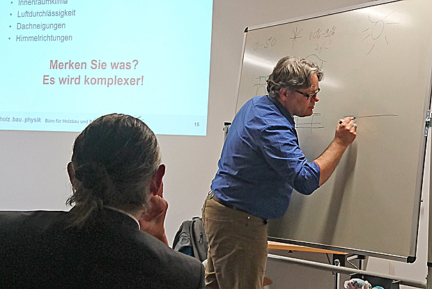 Der Holzbau-Ingenieur Kehl vermittelte den anwesenden Zimmerern, Architekten, Planern, Bauingenieuren und Holzbauern, wie nachhaltig funktionierende Holzflachdächer geplant und realisiert werden. Er ging vor allem auf feuchtetechnische und konstruktive Kriterien ein.